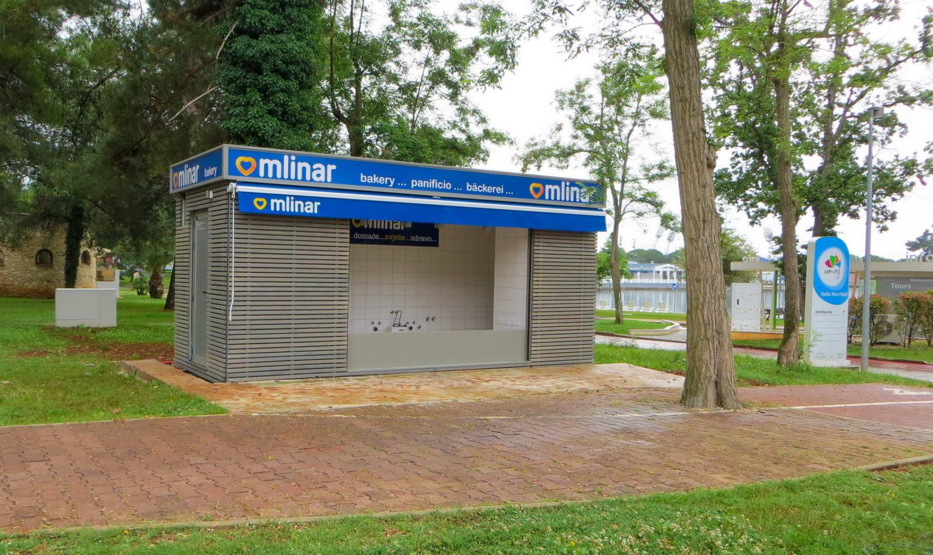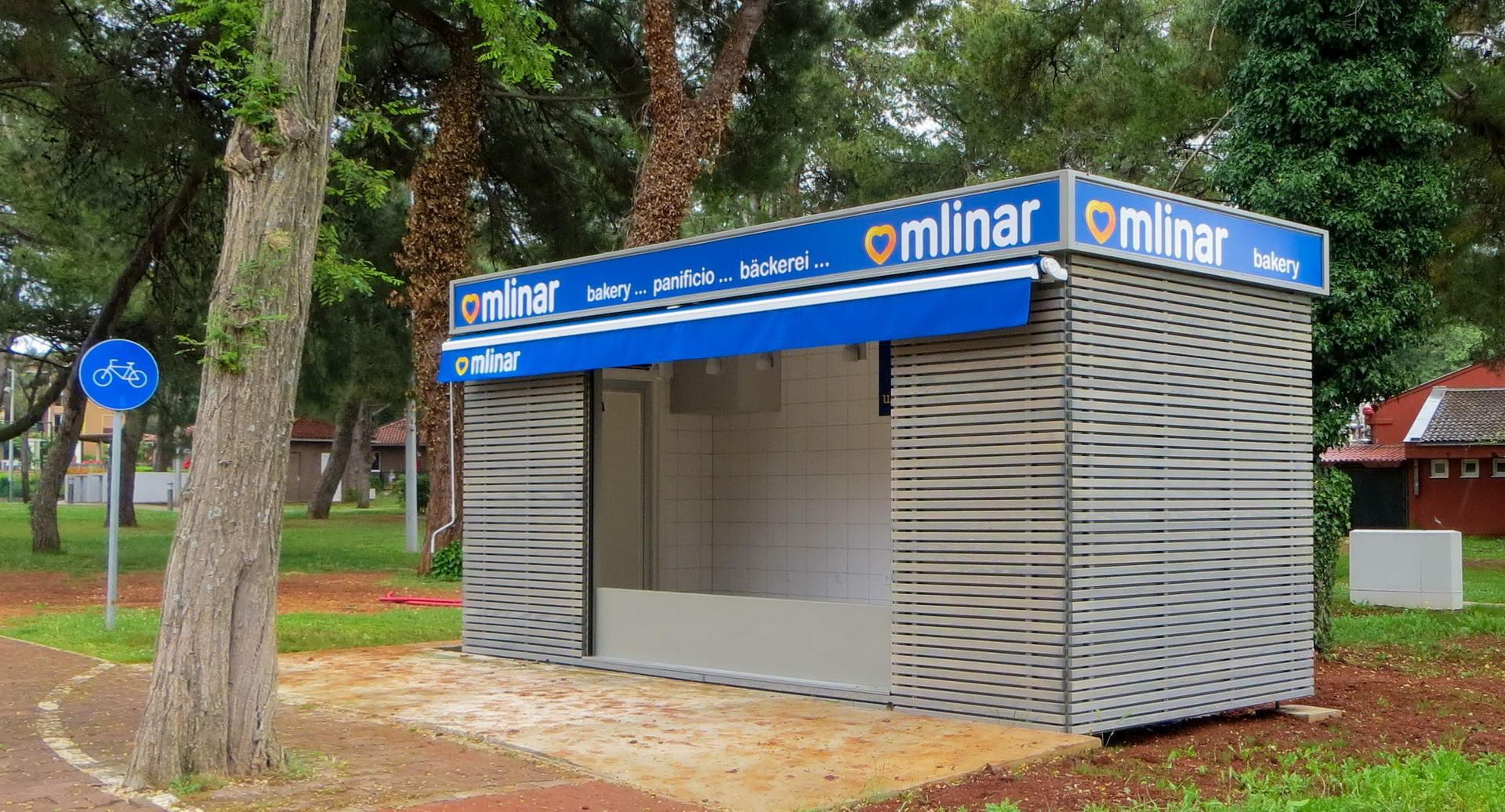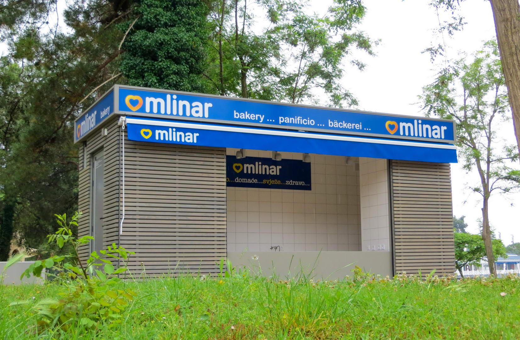 Za potrebe prodaje pekarskih proizvoda najvećeg hrvatskog proizvođača MLINAR, EUROmodul je projektirao i proizveo više komada custom made kioska tip 3400 dimenzija 6 x 2,5 m, prema individualnoj specifikaciji. Svojim jednostavnim dizajnom i fasadom izrađenom od drvenih letvi, kiosci se prirodno uklapaju na lokaciji u zelenom pojasu blizu mora.