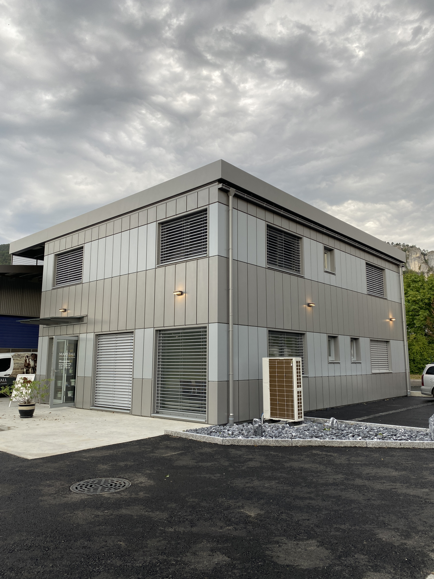 Na švicarskom tržištu uspješno smo realizirali projekt suvremenog uredskog objekta koji spaja vrhunski inženjering i moderan dizajn. Vanjskim izgledom dominira visokokvalitetna metalna ventilirana fasada naglašena ambijentalnom rasvjetom, dok sekundarni krov osigurava optimalnu izolaciju i dugovječnost. Uz precizno izrađeno vanjsko stubište, objekt nudi i potpuno opremljenu unutrašnjost s modernim sanitarnim čvorovima, pružajući maksimalnu funkcionalnost i udobnost korisnicima.